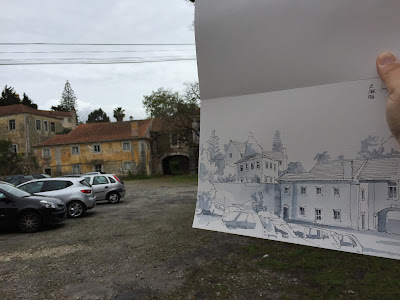 Por isso mesmo hoje experimentei fazer de forma diferente. Desenhei o contorno dos vãos pelo limite exterior das cantarias e por dentro pintei apenas o escuro da janela, ignorando por completo as linhas da caixilharia que tantas vezes tendo a desenhar e que me sobrecarregam o desenho para além de qualquer limite aceitável...